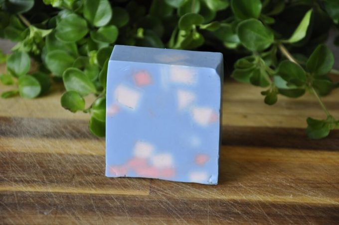 Blue Cubes is a cherry soap in blue with white and pink cubes.