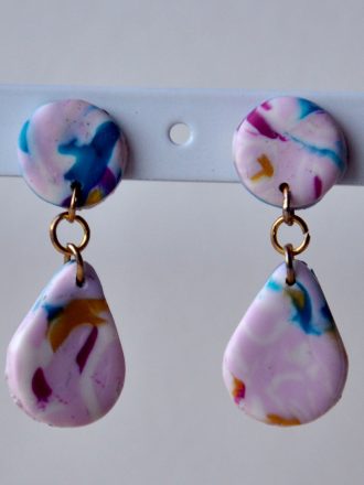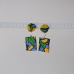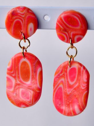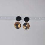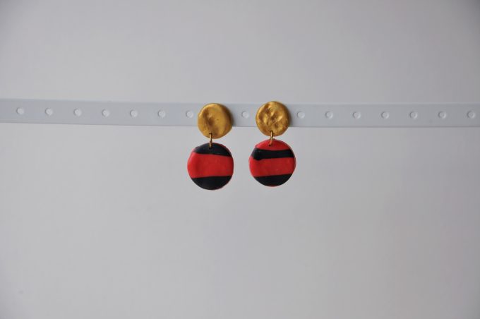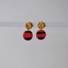Red and black striped earrings with a gold cratered disk stud.
